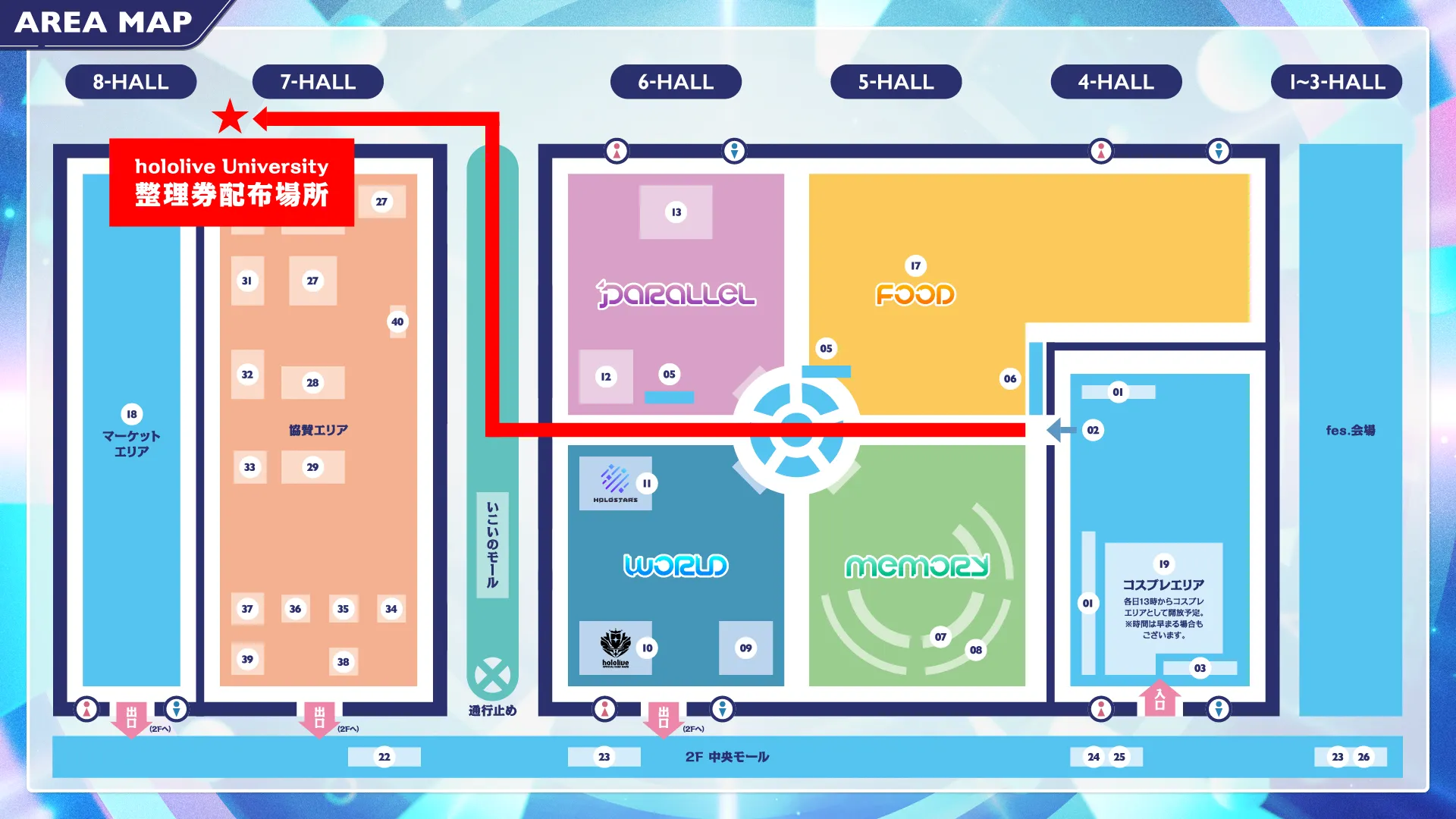 ※開場後に会場内に入場いただき、ホール6を出て「いこいのモール」を通り、7ホール南側駐車場広場の整理券配布待機スペースにお越しください。